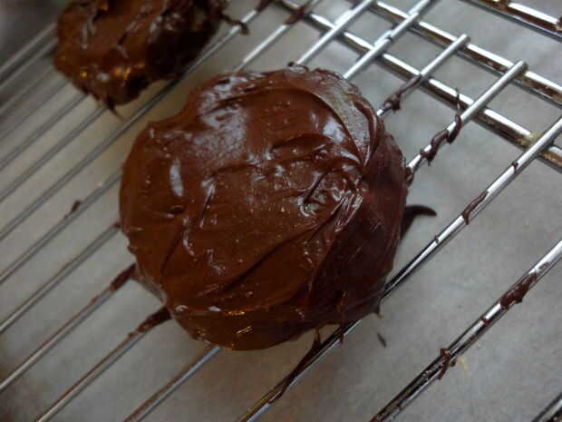Derrite 1 taza de chocolate semiamargo en el microondas en high por 1 minuto, remover hasta que derrita. Luego, "pintar" la empanada con el chocolate derretido. (Para cursores de pollo saltar esta parte)