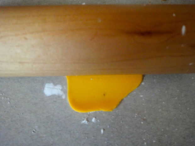 Teñir unos fondant amarillo, hasta obtener el adecuado color "kraft singles". Rodillo hacia fuera a delgadez cursi, cortar en cuadrados.