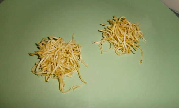 hacer unos círculos de los fideos cocidos. Forman las dos bases (bollos) de la hamburguesa.