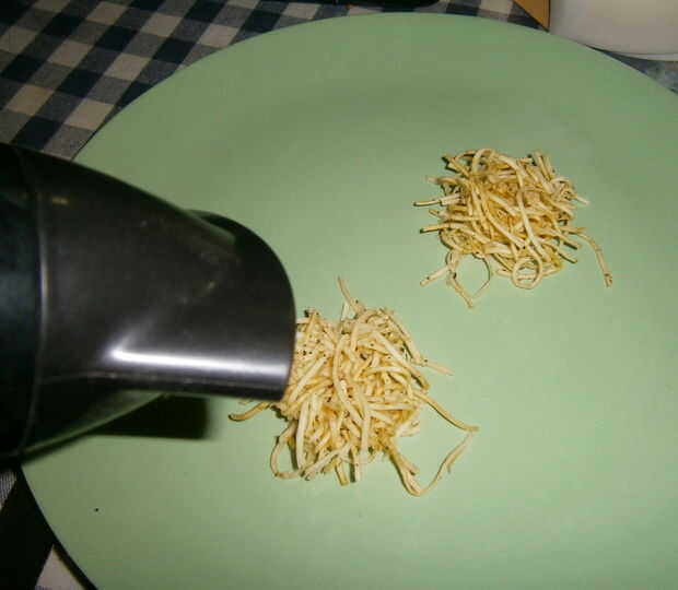 Ahora uso una placa o lámina abajo. Encienda el secador de pelo. Mantener en un nivel medio y pase sobre los tallarines. Se convertirá en seco y crujiente.