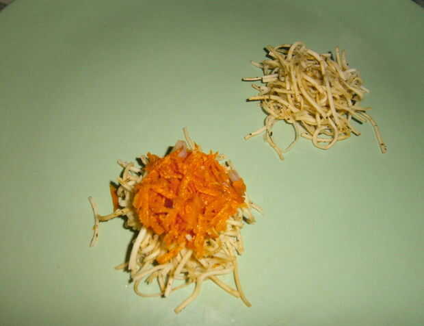 He hecho el relleno muy simple aquí. Tomé algunas zanahorias ralladas, vinagre, sal y pimienta. Coloqué el relleno sobre una base. Añadido pequeño de salsa de tomate.