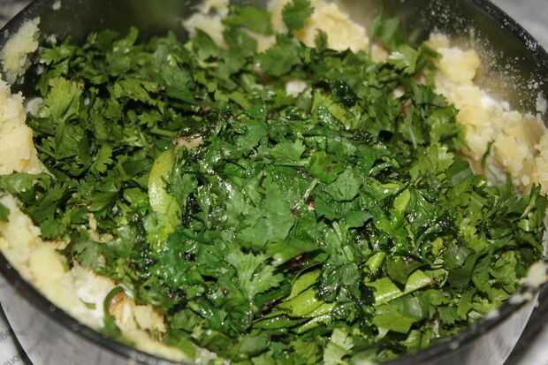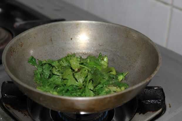 Añadir hojas de curry y hojas de cilantro y rehogar durante unos segundos.