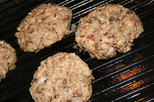 Cuando es hora de poner en la parrilla, tomar sus manos y tomar lo suficiente de la mezcla de seta para formar algo en el tamaño de una pelota de ping-pong. A continuación aplanar la bola con las manos en forma de empanada sobre una pulgada de espesor. Coloque en un plato y rociar la superficie de cada empanada con spray de cocina. Ahora tiempo de fuego de!