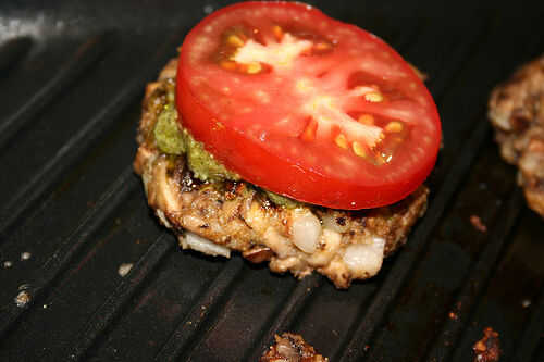 (* Nota: soy de un snob de tomate y yo soy muy exigente con él. El usé el tomate es un tomate de la herencia negra local que tiene un menos pegajosa entrañas y es bien agrio. Ya que la seta, cebolla y pan tienen un dulzor agradable a ellos, quería algo más ácido en esta hamburguesa, y por eso opté por poner en tal una rebanada gruesa.)