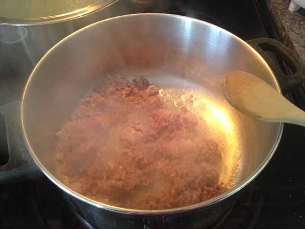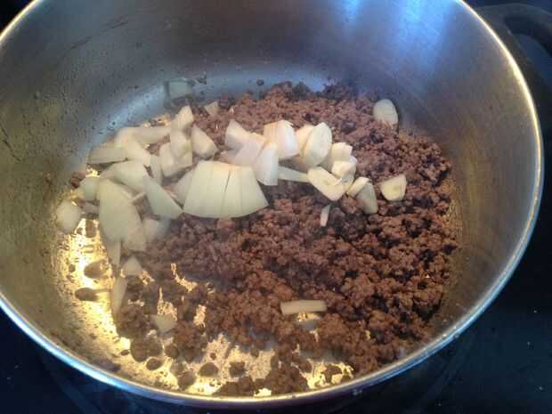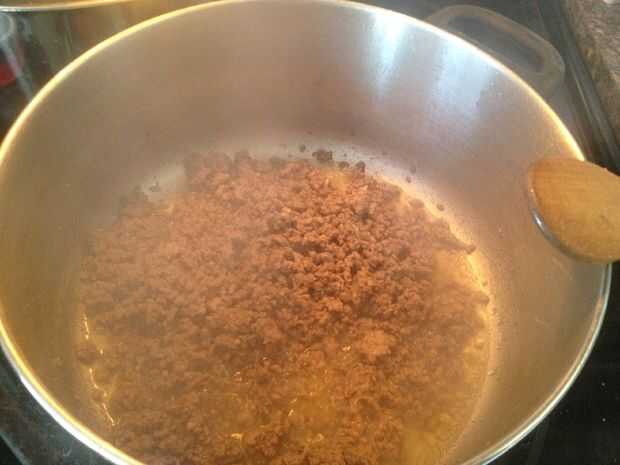 Derretir la mantequilla y sofría la carne de res molida seguido con cebolla durante 10 minutos, drenaje