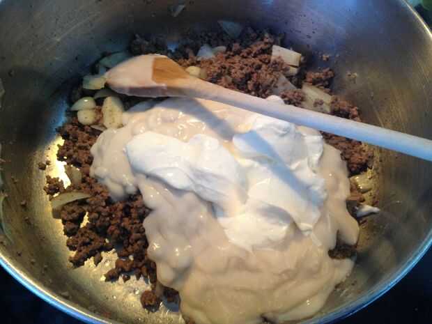 Añadir la crema agria y queso, cocinar hasta que caliente y queso fundido