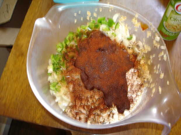 Drene todo el exceso de humedad de la TVP utilizando un paño limpio o colador. Luego añadir el resto de los ingredientes en el tazón de fuente grande con la TVP. Mezcla todo hasta que es incluso.