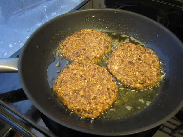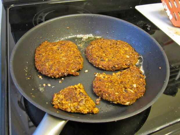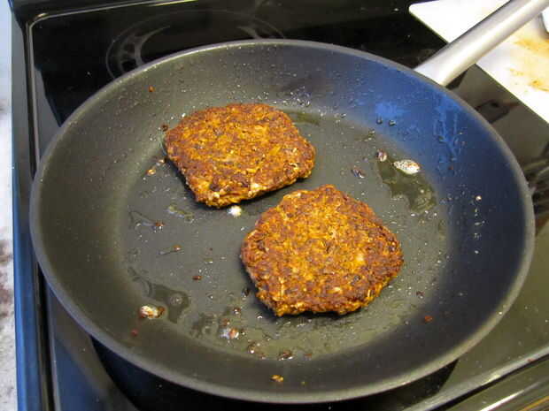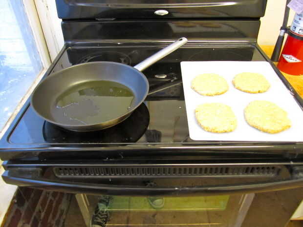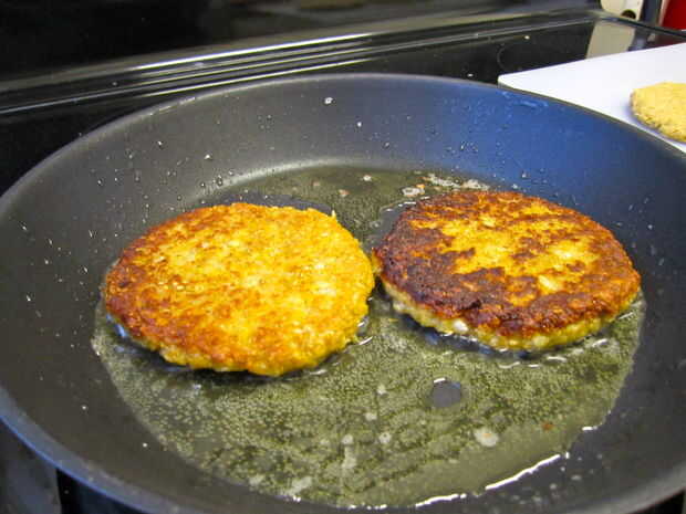 Calentar una sartén a fuego medio con el aceite de elección. Una vez que el aceite es agradable y caliente, coax las hamburguesas fuera de su estación de trabajo (tenga en cuenta que puede remodelarles un poco en la sartén si es necesario) y en la sartén. No masificar, aunque - 2-3 hamburguesas es lo máximo - si estás tocando demasiado no consiguen crujientes, van de vapor.