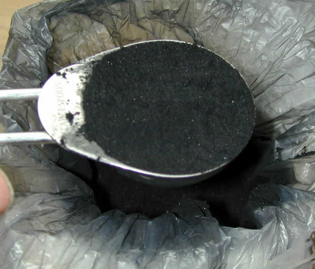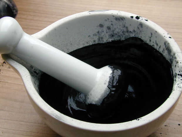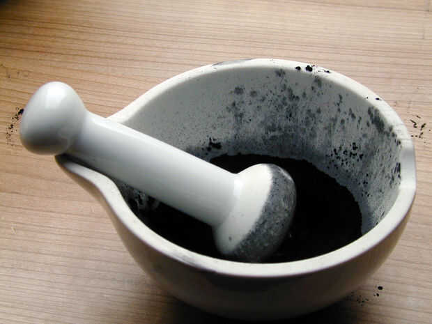 Disuelve el carbón en una cucharada de jugo de manzana (me gusta el sabor, se puede utilizar agua). Si utiliza tabletas de carbón se debe romper en un mortal antes que disolverlos.