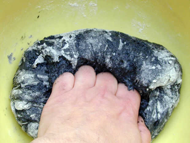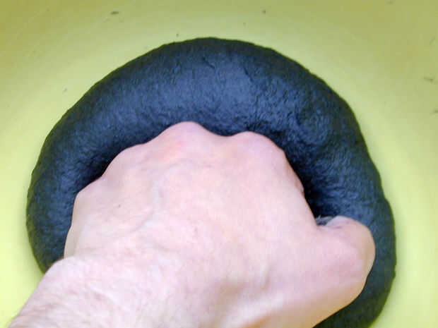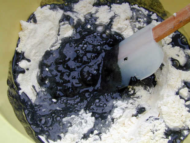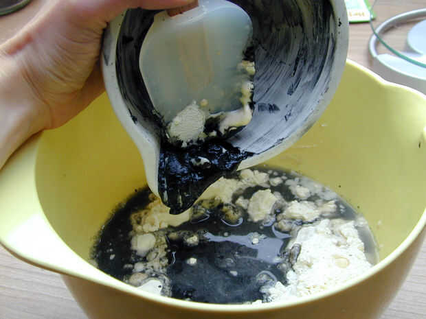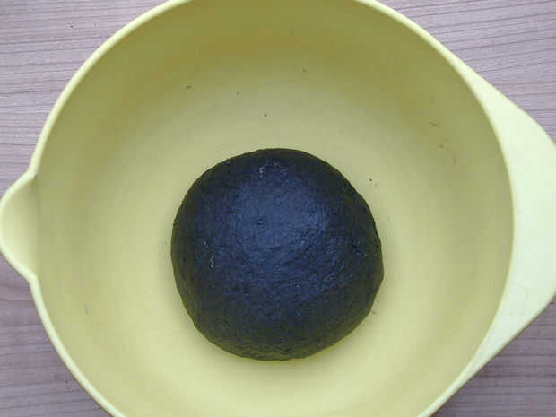 Añadir la mezcla de carbón de leña a la harina en el bol y mezclar todo.