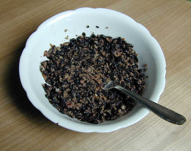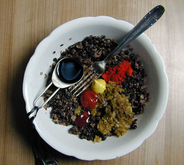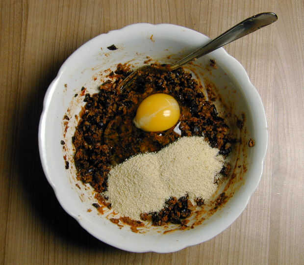 Frito la cebolla picada y el ajo en aceite de oliva hasta que comenzaron a dorarse y añadir a la pasta de frijol. Luego mezclé en todas las especias, el huevo y pan rallado y el carbón.