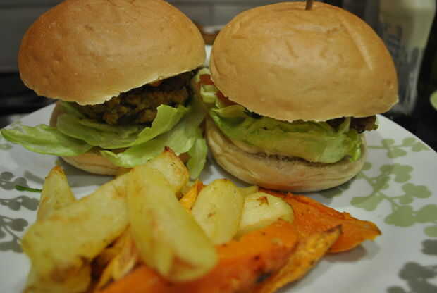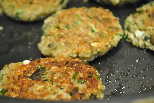 6. cuando el aceite esté caliente, poner 4-5 hamburguesas en la sartén a cocinar a fuego bajo-medio. Después de 5 minutos, cuando está dorado por un lado, voltear y cocinar del otro lado