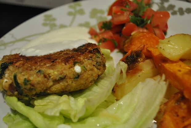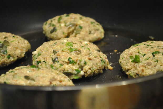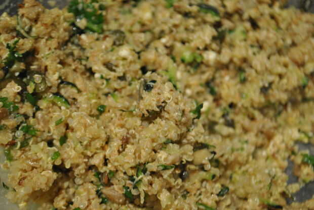 3. en un tazón grande, mezcla de quinoa, cilantro, calabaza, 2 huevos y zumo de limón. Añadir las semillas y el queso feta desmenuzado.