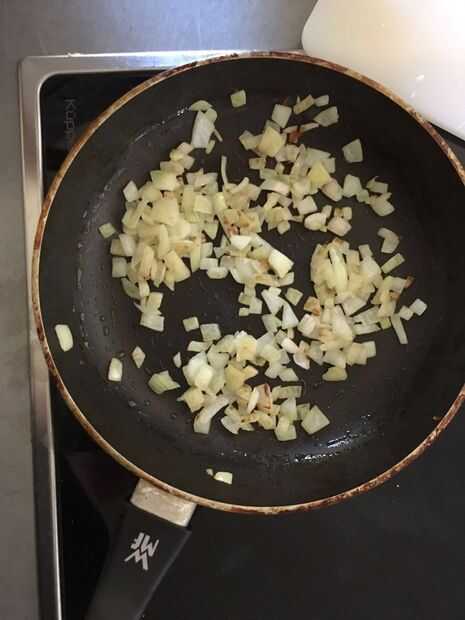 Cocinar la cebolla picada en una sartén con aceite de oliva cubriendo la parte inferior a fuego alto.