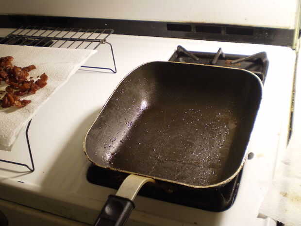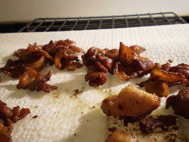 Drene el aceite en un recipiente adecuado y el tocino en una toalla de papel.