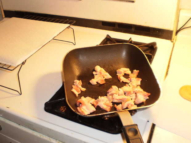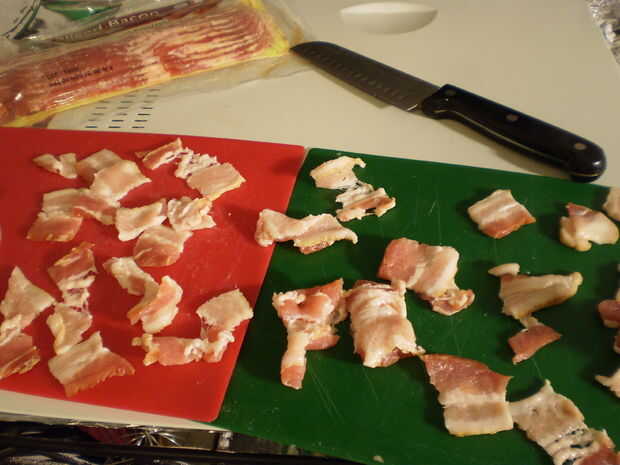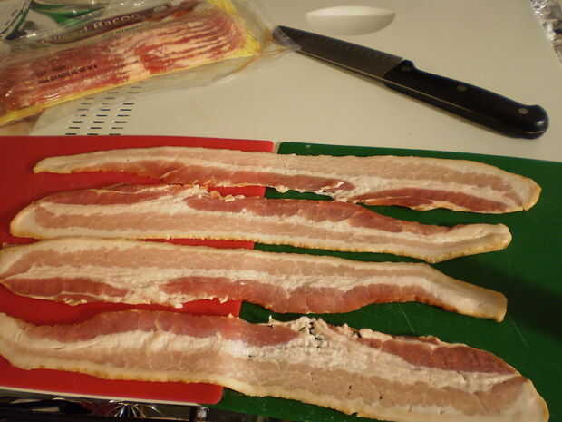 Para este paso necesitarás cuatro tiras de tocino, cortado en "chips" de 3/4" a través de.