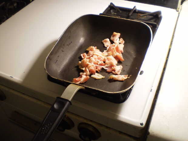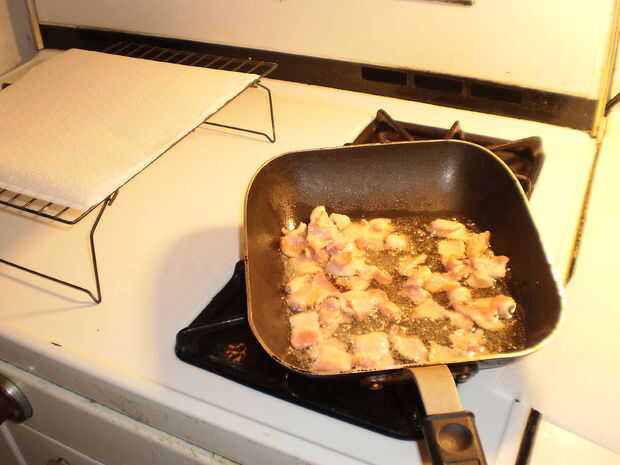 Su cocina debe empezar a oler muy muy bien por ahora, así que vierta más aceite para cubrir el tocino, pero no ahogarlo.
