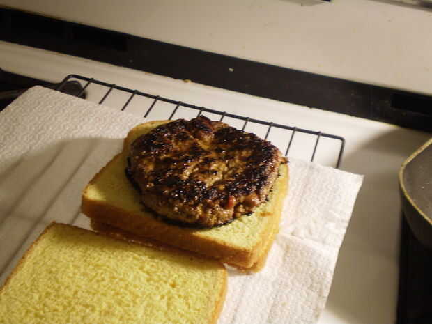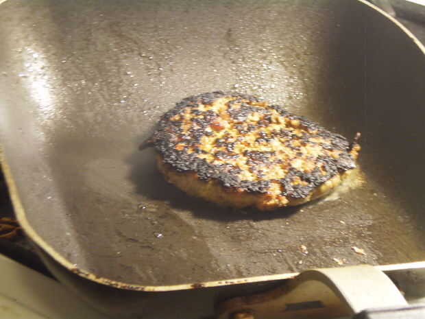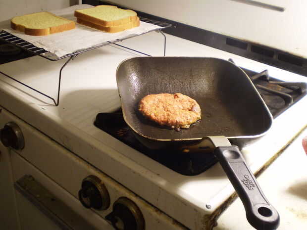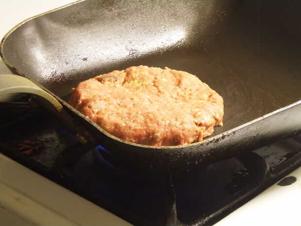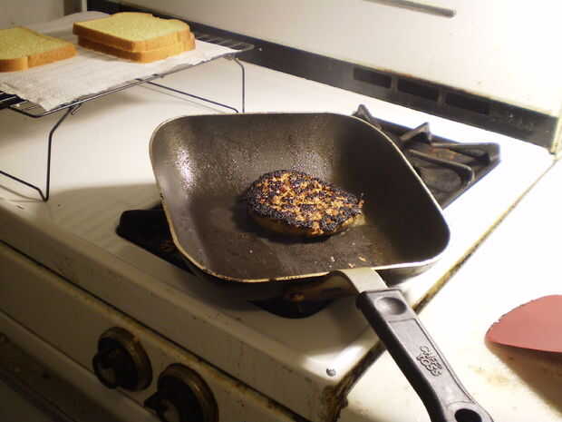 Ya tenéis una empanada de la hamburguesa. La sartén debe ser fría, como antes. Recoger la empanada y poner en la sartén. Esta es la parte más difícil. Encienda el gas completo. (luz, duh) Ver su hamburguesa. Cuando empieza a tener esos zarcillos pocos primera de humo, agitar la cacerola, mueve alrededor, conseguir su hamburguesa en sus propios jugos. Ahora viene la parte más difícil. A pie. Ir en la otra habitación para uno o dos minutos. (Pero no empezar a jugar Paper Mario o algo. acabo de leer un instructable. o descremada, si eres impaciente) Obtener su espátula y darle la vuelta. El fondo debe ennegrecido en un anillo roto por la parte exterior, con manchas negras en el centro.
