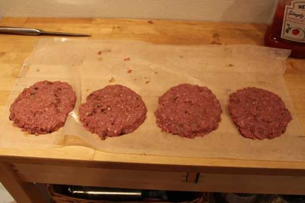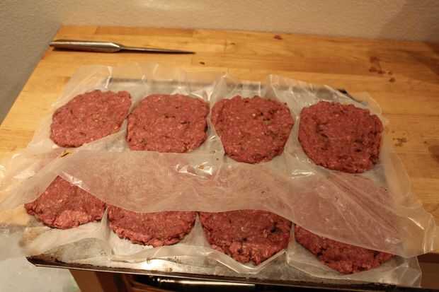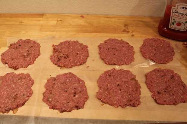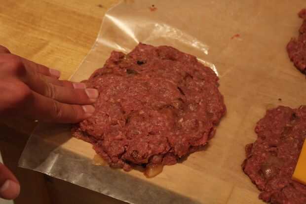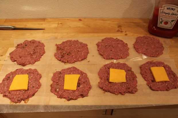 Romper la carne uniformemente en 16 bolitas y situar los primeros 8 en papel de cera. Aplane cada 8 de las bolas en una empanadas finas, medianas y grandes. En la mitad de las hamburguesas, coloque un trozo de queso, no grueso y asegúrese de que el queso es al menos la mitad de una pulgada de los bordes de la empanada.