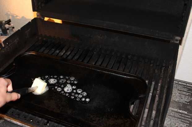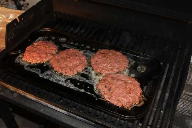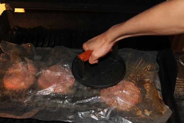 Traigo la mezcla de condimentos y sus empanadas a la parrilla precalentada (o en la parte superior de la estufa, si lo prefiere). Derretir la mantequilla en la plancha plana. Coloque cuatro de las hamburguesas en la mantequilla. Cubrir con el papel de cera eran y smash con un machacador de burger o con un plato, o cualquier otra cosa que funciona. Retire el papel de cera.