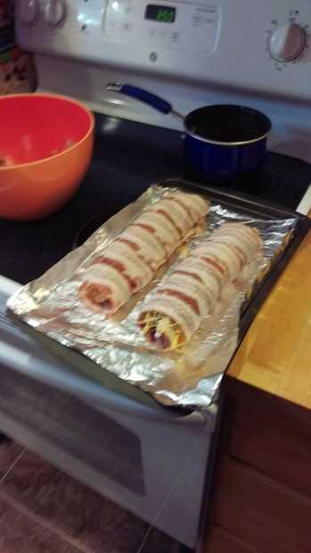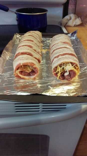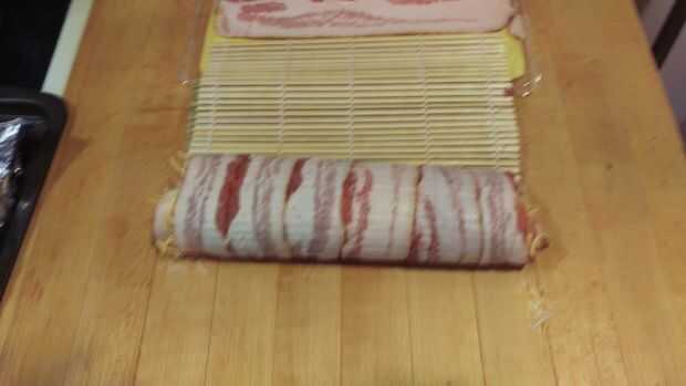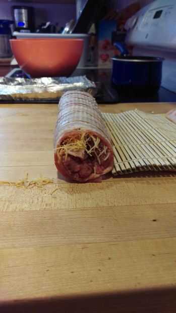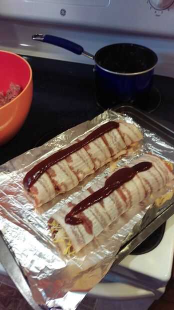 Así que primero toma el tapete de sushi y ruede para arriba la mezcla de tocineta y hamburguesa. Esto se hizo hace un tiempo y a poco fui con la estera rodante y enrolla muy bien, me que estoy seguro de que hay direcciones mejor ahi que ir por ella, pero que es la forma en fue para mí. Después el balanceo que pongo dos rollos que hice en un aluminio frustrado horno 350f, hoja y set de cocción como el horno pre calentado asfixiada rollos en salsa BBQ y luego colocar en el horno. después de 15 min tomé hacia fuera y volteado y RE-applied BBQ salsa. Después de otros 15 cumplí el horno para asar en Hola unos minutos hasta que la parte superior estaba crujiente.