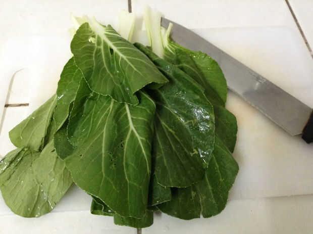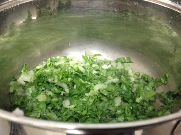 Picar para arriba algunos verdes de su preferencia, como la Col China, espinaca, col rizada, berza, etc.. Mida 1 taza verdes y volcado en una olla con 2 cucharadas de agua. Ponga la tapa y el vapor hasta los verdes están marchitas pero aún brillante en color.