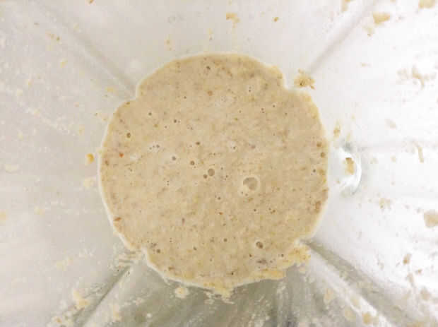 Puré de 1/2 taza de nueces, soja 1 taza cocida y 1 taza de agua en la licuadora. Deténgase cuando la mezcla es todavía un poco gruesa.