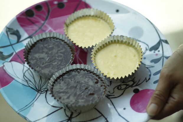 Hacer las mezclas de torta de chocolate y amarillo como según las indicaciones en la caja.