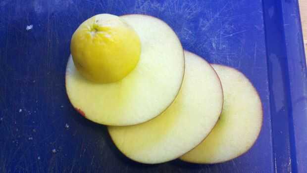 Cortar rodajas de la parte inferior de la manzana y frotarlos con jugo de limón para que no dar vuelta a marrón.