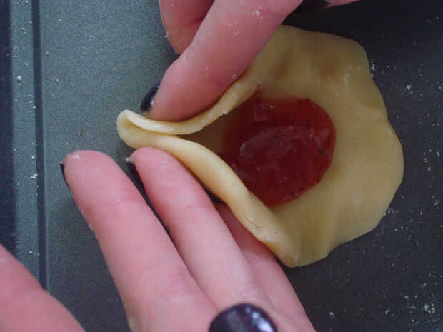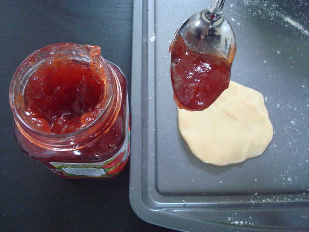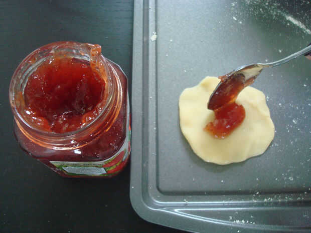 3. Coloque la bandeja para hornear galletas. Poner una cucharadita de jalea (o cualquier relleno que más te guste) en el centro del círculo.