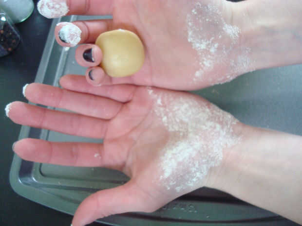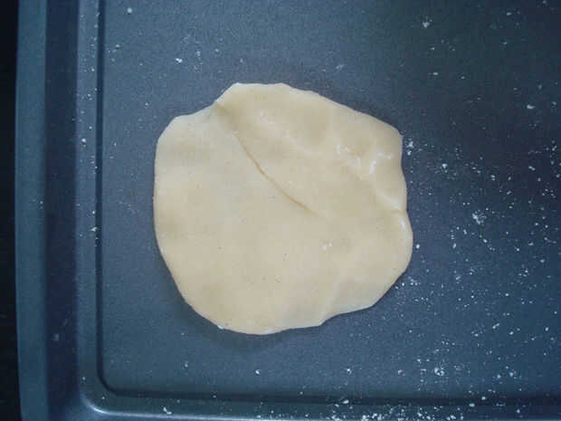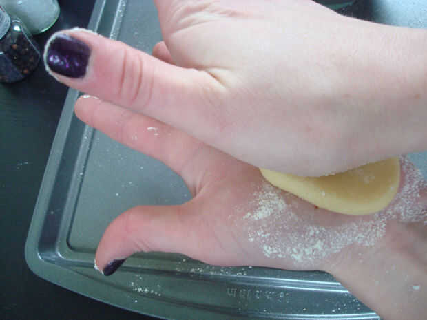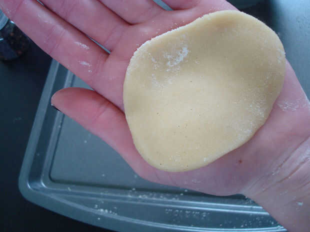 2. Utilice las palmas de las manos para aplanar la masa en un círculo. Asegúrese de que el círculo es el mismo grueso todo (aproximadamente 1/8 de pulgada). Desea que los círculos aplane a ser aproximadamente de 2 1/2" diámetro. Puede usar un rodillo y un cortador de galletas para esto pero me resulta más fácil hacerlo a mano.