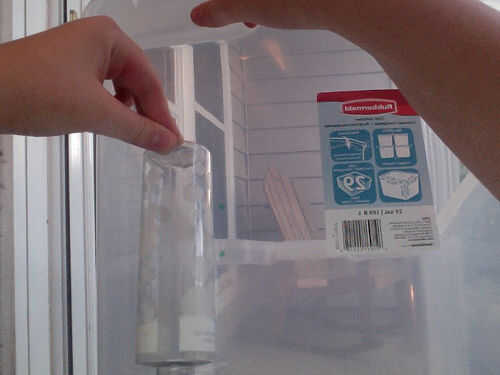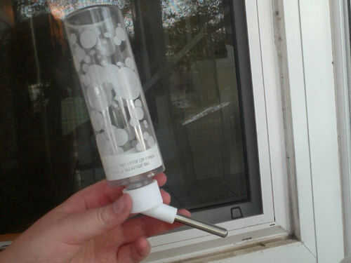 Es hora de tomar la longitud del cable y pasarlo a través de los agujeros. Forma en un ti y presione en los orificios superiores. Luego, tire de cada extremo a través de los agujeros correspondientes de la parte inferior. Uno de los cables gire sobre sí mismo unas cuantas veces para fortalecerla y luego formar un bucle final. Lo mismo para el otro lado, pero hacer un gancho. Llene la botella de agua según las instrucciones y adjuntarlo a la jaula.