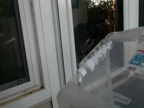 Los puntos pequeños son donde vas a perforar para pasar el cable del soporte a través de. Usted también necesitará dibujar y perforar un agujero más grande que el caño se puede atravesar. Más de un óvalo - le permite ser un poco más alto que necesita le puede sacar la botella fácilmente para volver a Ilenarlo.