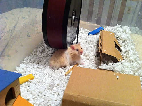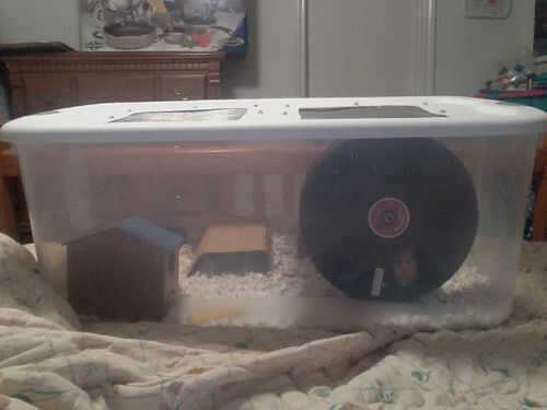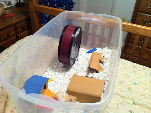 El recipiente está casi listo. Aniquilar con un paño de la colada así que allí no es ningún plástico en la parte inferior. Completa con ropa de cama (viruta de madera no tratado o fibra de papel como Carefresh) y pat hacia abajo. Agregar los rueda, plato de comida y cubby y su hámster a dormir en casa. También debe agregar juguetes para el hámster - les encanta cosas como "túneles" de cartón y cajas de cartón de huevo.