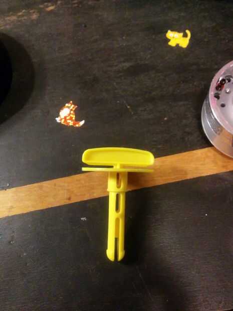 La rueda de hámster que tengo está diseñada para ajuste de presión entre los barrotes de la jaula de mi hamster. (En la foto es el árbol amarillo de la rueda de mi hamster). Para que se ajuste con mi cabeza de VCR, el eje de la rueda necesita algunos pequeños ajustes.