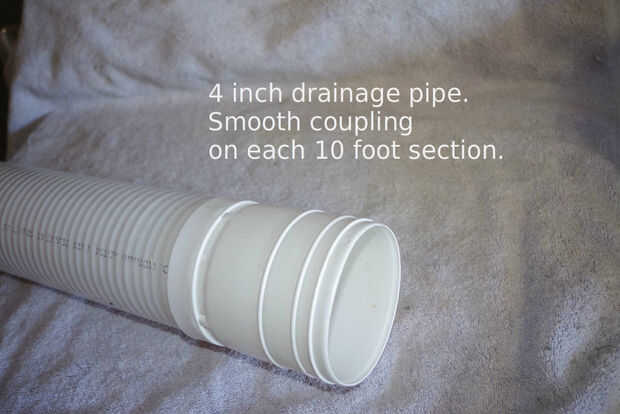 Temprano en el diseño nos decidimos por la tubería de drenaje corrugado de 4 pulgadas (no perforado) como un tubo razonable para la