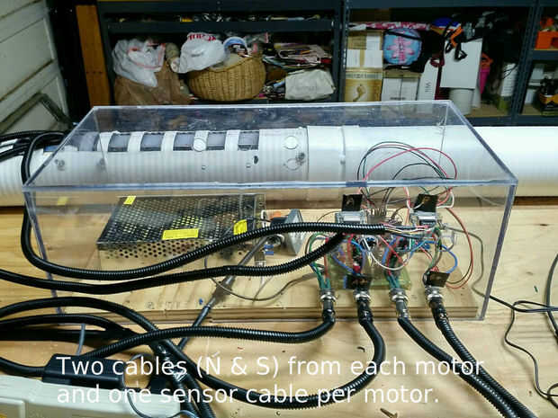 Pares de bobina están conectados en paralelo. Para cada motor de 4 pares de bobina, traje juntos el mismo fin (p. ej. del norte) de cada par de bobinas y soldadas a un plomo solo va a la caja de control. De esta manera, el número de los cables del controlador fue cortado por la mitad. Guardé todos los extremos del norte juntos, hacer un cable con el norte conduce para cada uno de 4 bobinas. Mismo proceso para los extremos del sur rindió un cable con conductores del sur para el mismo 4 bobinas. Repite para el segundo motor, dio un total de 4 cables de 4 hilos hacia la caja de control.