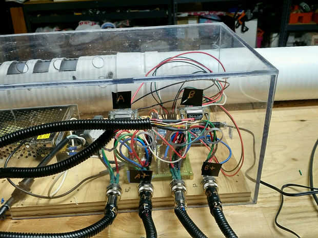 Para mantener la electrónica contenida y aseado me los puse en una caja que tenía de un anterior proyecto desarmado. Mi objetivo era hacer todo el sistema storeable y transportable. Esto requiere poder desconectar la electrónica del tubo donde se montan los motores. El Arduino Mega, el tablero de conductor y fuente de alimentación fueron montados en el base de contrachapado de 3/4 de pulgada. El acrílico cubra ya 3 conectores 4-pin así que compré un 4 y habían permitido que todos los cables de la bobina a venir muy bien. Compré dos conjuntos de conectores D-sub de 9 pines (macho y hembra) y soldadas a los cables del sensor. Esto es todo en la parte "posterior".