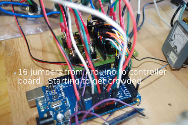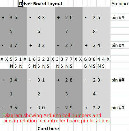 Para los pares de 8 bobina (4 pares en cada "motor"), tiene 16 pines de Arduino que la tarjeta de conductor que bobina para energizar y que qué polaridad. Por ejemplo, para dada bobina, si el pasador de pares es alto (+ 5v) y el perno número impar baja, la bobina está activada al norte. Nunca debería suceder que pernos impares e incluso son altos, aunque hay más transistores en el tablero de conductor para prevenir desastre si esto ocurre. Los 16 puentes también tienen protección en forma de diodos, para evitar que cualquier corriente perjudicial que fluye hacia el Arduino. Llegamos a esta cautela la manera dura.