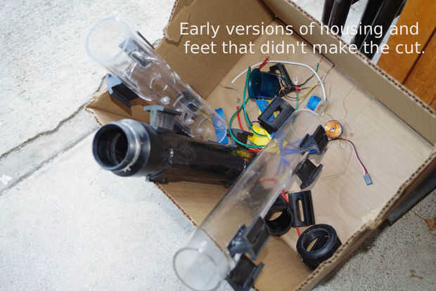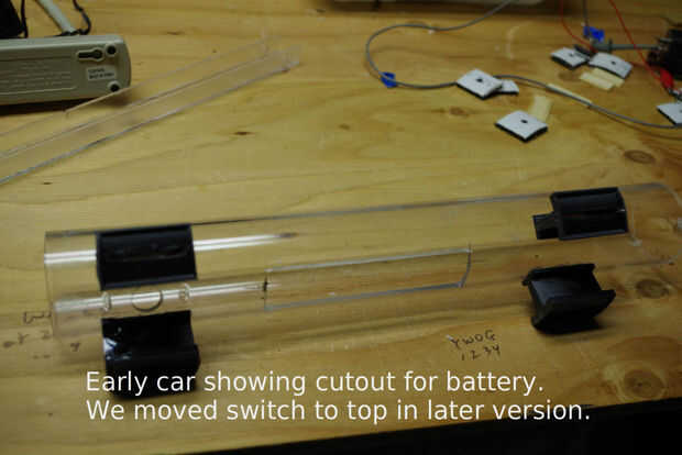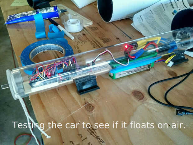 Para el coche de la vivienda, después de tentativas iniciales con tubo de fontanería de ABS 2 pulgadas que se establecieron en 2 pulgadas claro tubo acrílico. Tubo claro le permite ver lo que hay dentro, y resultó que el siguiente diapositivas de tubo (1 3/4 pulgadas) tamaño menor estrechamente dentro de la tubería 2" OD. Esto hizo para montaje prolijo del coche delantero y trasero. Carcasa del motor de ventilador en la parte delantera y tapón con un orificio pequeño en la parte posterior cuentan con manguitos de tubería de diámetro más pequeño y se sujetan con tornillos.