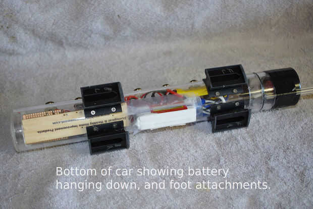 Los cuatro pies se fijan el coche en el ángulos de 90 y están construidos para ajustarse a la curva convexa del coche y la curva cóncava del tubo. Hubo mucho de prueba y error para el coche para flotar con éxito en lo pies. Después de probar pies "planos", aprendimos que los rodamientos de aire necesitan bolsillos empotrados. Esto se extiende y contiene el aire que es comprimido entre el pie y la pared del tubo. También, un gran flujo de aire es más efectivo que un chorro de presión más alta.