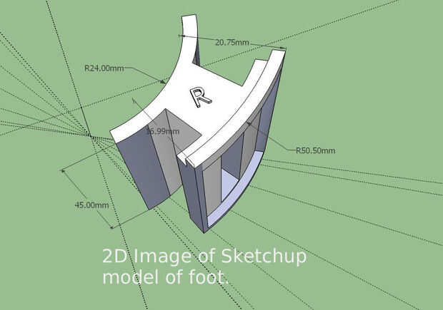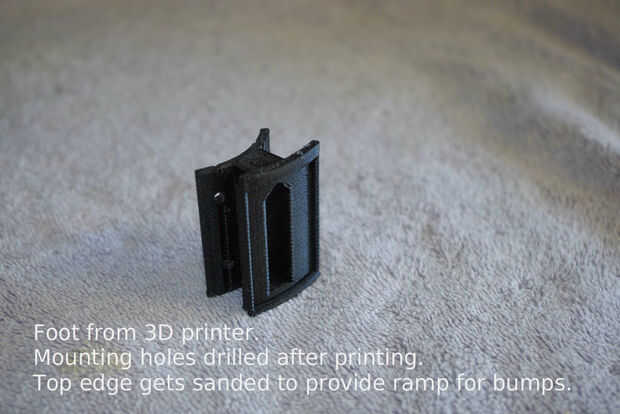 Los pies fueron dibujados en Sketchup y realizados en plástico ABS con impresora 3D de mi amigo. Esto fue una gran técnica ya que permitió la prueba y error. En las primeras tentativas nos pegan los pies al coche. En el diseño final un reborde fue ampliado para permitir que los pies para atornillarse en el coche. El modelo de Sketchup tuvo que evitar cualquier horizontales sin soporte para la impresión 3D exitosa.