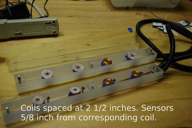 Los terminamos con los motores son dos pares de cajas de acrílico, un par unas 12 pulgadas por 1 pulgada de ancho por 3/4 pulgada de profundidad, el otro par (nuestro primer intento) 8 pulgadas de largo. Cada par motor tiene una caja que contiene otra caja que contienen sólo bobinas y sensores y bobinas. Las cajas se montan en el tubo para que el PMs en el coche pasa cerca de los sensores y las bobinas. Un Arduino Mega y tablero de energía especialmente construidos responden a los sensores y envían energía a las bobinas para dibujar al PMs a las bobinas. Cuando 13:00 se va introduciendo, su predecesor PM se empuja lejos de la misma bobina (PMs están dispuestos en la alternancia de polaridad).