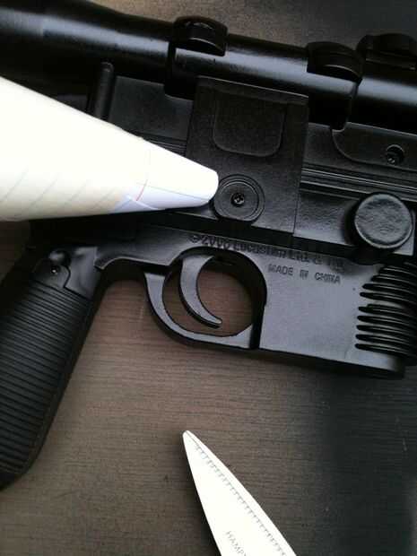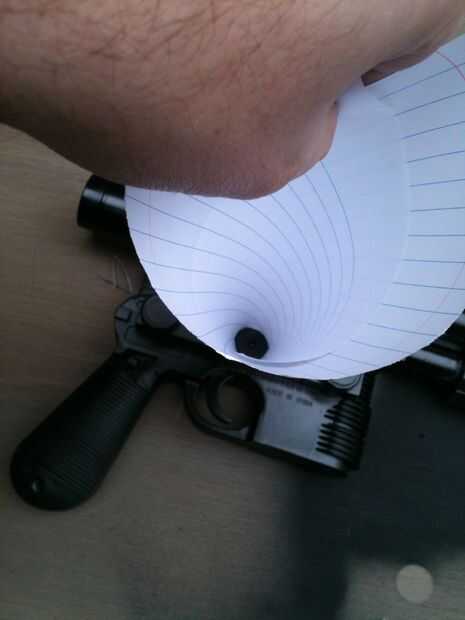 A continuación, utiliza un trozo de papel de cuaderno y había grabado en forma de embudo. Poco a poco corto frente a la punta del papel hasta que el agujero resultante era del mismo tamaño que uno del perno principal buscando cosas sobre el plástico. Puse el papel sobre la pieza y el rociado de la plata en el agujero. Este método era mucho más rápido que tratar de cinta la pistola entera.