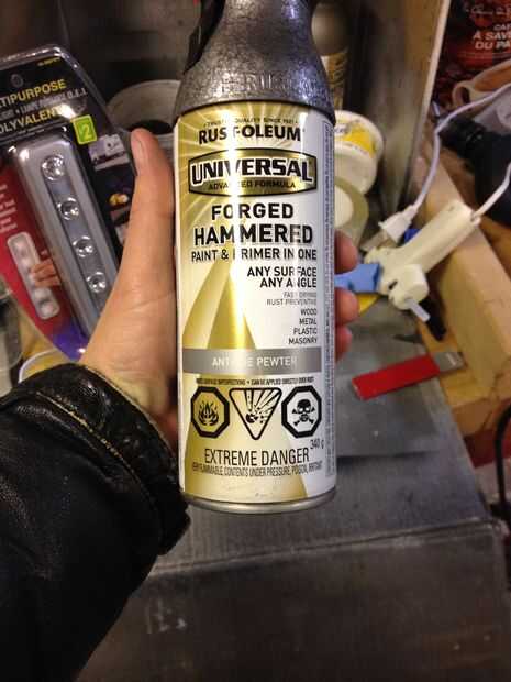 Investigué un montón de fotos y foros de personas que construyen réplicas de HIC (Han en carbonita) y no hay respuesta firme en cuanto a qué color utilizar. Parece depender de qué escena de qué película estás viendo. Encontré un Rust-oleum Universal llamado martillado antiguo peltre que me gustó el aspecto y parecía pegarse a cualquier cosa que he probado en. No tengo una cabina de pintura en el garaje, así que simplemente compró un rollo grande de láminas de la sección de pintura de la tienda de hardware de plástico y lo colgó de las estanterías. 4 o 5 capas más adelante, las cosas no está demasiado mal, buscaban OMI. Decidí usar el estaño antiguo martillado en las partes donde Han fue congelado, mientras que utilizando un encendedor de plata alrededor de los bordes y lados.
