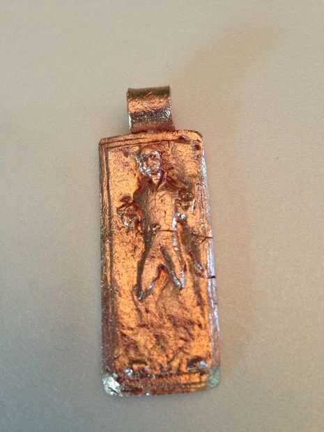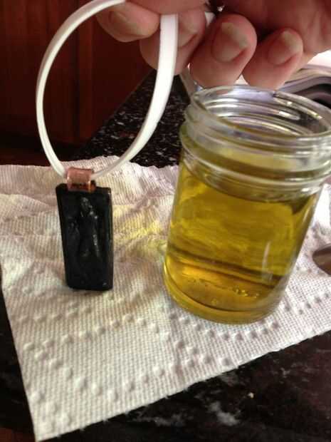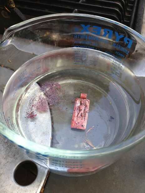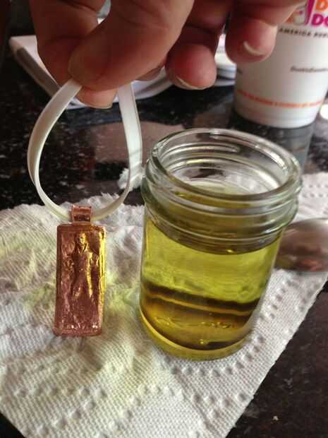 ¿1. Si vas para el aspecto real de la carbonita, entonces usted quiere que sea negro, derecha? Va a hacer una inmersión relativamente rápida en la solución de hígado de azufre. Preparar una solución de aproximadamente 250 mL (1 taza) de agua muy caliente con un trozo de tamaño de un guisante pequeño de hígado de azufre. Utilicé un trozo de plástico de una jarra de leche para hacer una manija que sumerge. Usando guantes, la inmersión y la pieza en la solución de un lado a otro. Dará vuelta colores muy rápidamente. Retírelo cuando esté satisfecho con la mirada y enjuáguelo abundantemente con agua. Aquí hay más información en el desarrollo de una pátina con hígado de azufre y la eliminación de la solución.