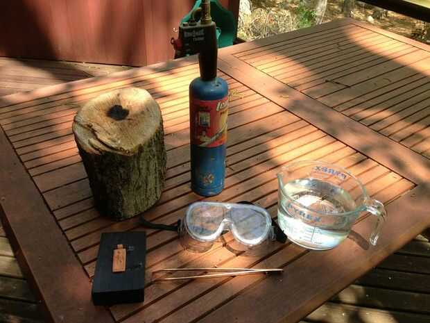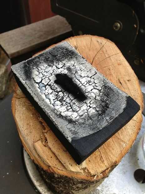 2. preparación de la pieza de fuego. Recoger y ponga su equipo de seguridad y preparar el espacio de trabajo. Tener el recipiente con agua para enfriamiento justo al lado de la zona de la antorcha, antorcha y superficie prueba de fuego en un área bien ventilada. Colocar la greenware en una superficie de prueba de fuego como el bloque de carbón aquí. Encienda el soplete y jugar la flama hacia adelante y hacia atrás sobre la pieza. Lo primero que sucederá es que la carpeta orgánica prenderse fuego y quemar. No se alarme cuando ves tu artículo comienzan a quemarse, se supone que para hacer eso. Mantener la llama en la pieza todo el tiempo y hacer que brille un cálido rojo de cereza. Desde aquí, mantener la llama moviendo lentamente sobre toda la obra, y hacia atrás para mantener ese color y calor durante unos 15 minutos (si estás usando arcilla de plata, desea más de un color naranja brillante durante 10 minutos). El bloque de carbón de leña fue quemado bastante bien lejos por esta llama como se puede ver aquí.