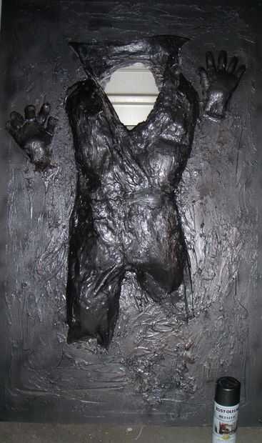 Después de otro día de secado, estaba listo para rociar pintado todo. Este fue otro de los puntos que necesitaba para hacer algunas decisiones difíciles sobre cómo fiel al original que iba a ser. Me ha decepcionado descubrir que Lowe no lleva Carbonite pintura de color. Posteriormente, he optado por martillado de Rustoleum marrón. Tenía un aspecto agradable de bronce con un acabado metálico. Utilicé casi dos latas para poder cubrir totalmente el marco entero y el cuerpo con dos capas. En algunas partes del cuerpo, parecía que el bronce llevaba y una de plata brillaba a través de. No pude averiguar por seguir pasando en el mismo lugar así que lo dejé. En este punto, permite a algunas personas ver la obra casi terminada y recibí mi primera crítica. Un amigo señaló que equivocaron el color. Insistió en que era más un bronce. Después de mirar más fotos de Han Solo en carbonita, cedió y compró algunos Rustoleum metálico gris. Sólo necesitaba uno puede cubrir todo este tiempo. No estoy seguro si es el gris metalizado o la combinación de los dos colores, pero creo que salió bastante bien.