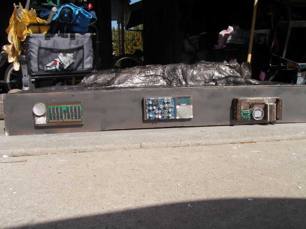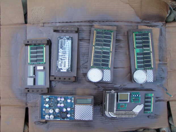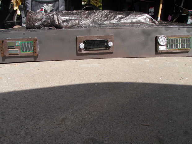 El último paso es agregar los paneles de control. Como he mencionado anteriormente, no incluso intento ser fiel a la original. Sólo incluí a tres a cada lado en vez de cuatro. Mi primer paso fue cortar seis 7" pedazos de una 1" X 4" de largo y pintura de aerosol les. Después de que seque, pegué todas mis piezas de computadoras al azar y difuntos pantallas LCD en los tableros. Para dos de los paneles, rosca en algunos mangos de dresser busca funky que tengo a la venta para $0,25. Me pasé un poco de esfuerzo extra en lo que llamo el "panel de héroe". Encontré una viejo doble pantalla de siete segmentos y había pegado en una lata redonda de menta. He podido programarlo para desplazarse al azar a través de "extraterrestres" dígitos utilizando un viejo 1 estampilla básica. Diferentes segmentos en y apagando, pude hacer una cuenta atrás efecto tipo. Sé Arduinos son el microcontrolador en, pero sólo necesité siete pernos de hacer algunos simples encendido y apagado de la conmutación. Una vez todos los paneles fueron pegadas y secas, usé tornillos para madera para fijar los paneles al lado. Para el panel del héroe, perforé un agujero de 3/4 de pulgada en el lado de la estructura de los cables a la Basic Stamp que os adjunto en el interior de la secuencia marco. Luego pegué el panel del héroe sobre el agujero y el traje fue hecho.