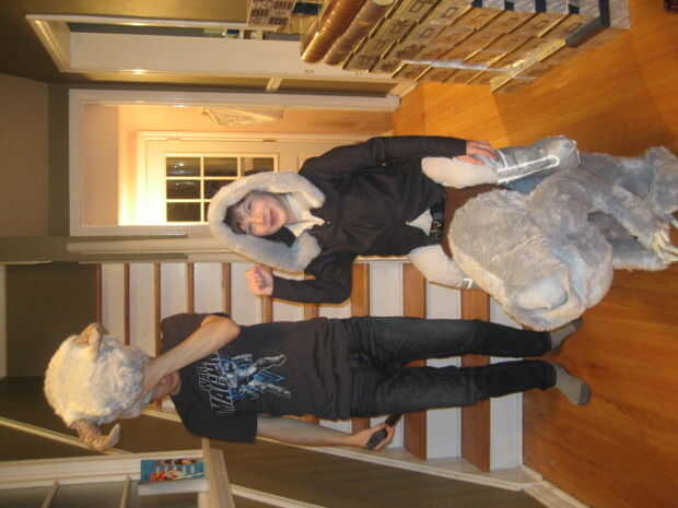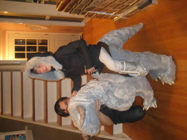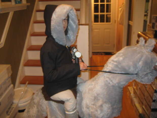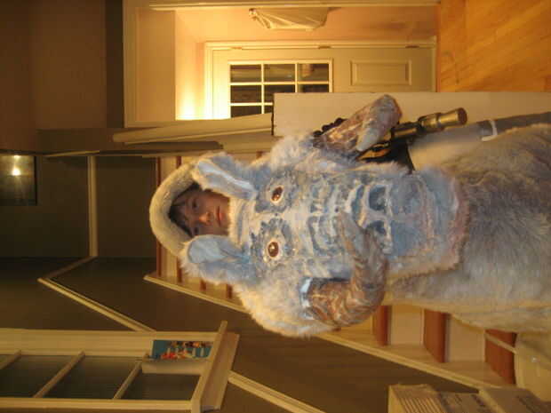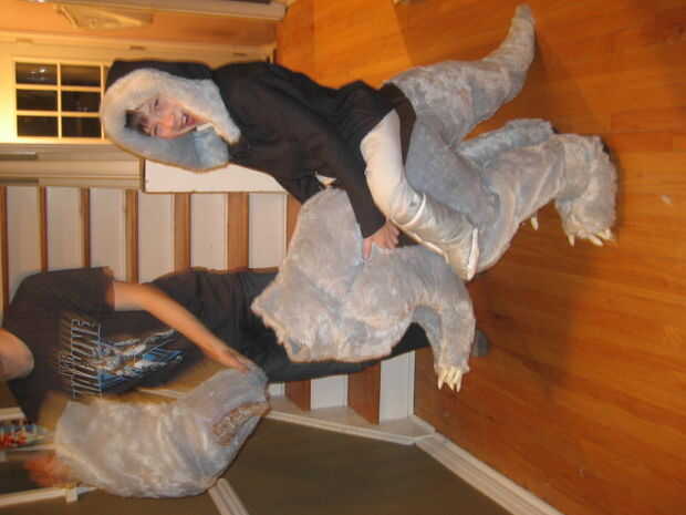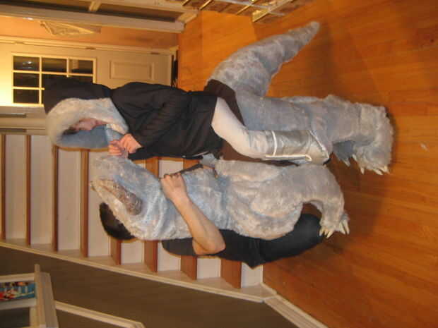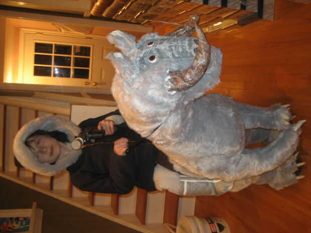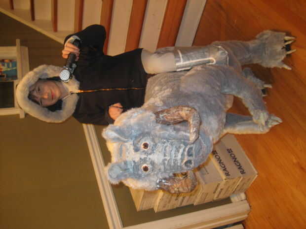 Recorta y construye la parte inferior del cuerpo haciendo las piernas primero, uniéndolas a las secciones de cola y el torso, el cosido en bateo a ancas forma, terneros, cola y el torso. Con que hacer hecho de papel maché garras y cuernos había construido a los pies como botas cubiertas y había atado a la silla de montar y combo falsa pierna/arranque. Por supuesto hubo varios ajustes en el camino para ajustar mi hijo conseguir adentro y hacia fuera. Una vez que todo parecía bien, luego pasó a los tirantes que sostienen el Tauntaun y la parka que cubre los tirantes y crea la ilusión del jinete.